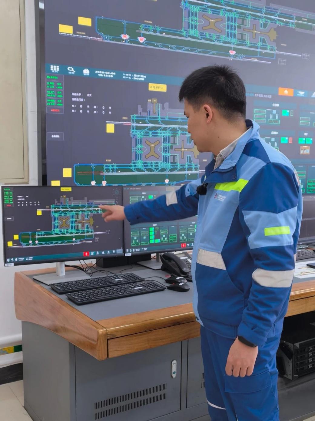 深圳機(jī)場(chǎng)飛行區(qū)管理部助航燈光機(jī)務(wù)員袁淦雄緊盯著助航燈光監(jiān)控系統(tǒng)