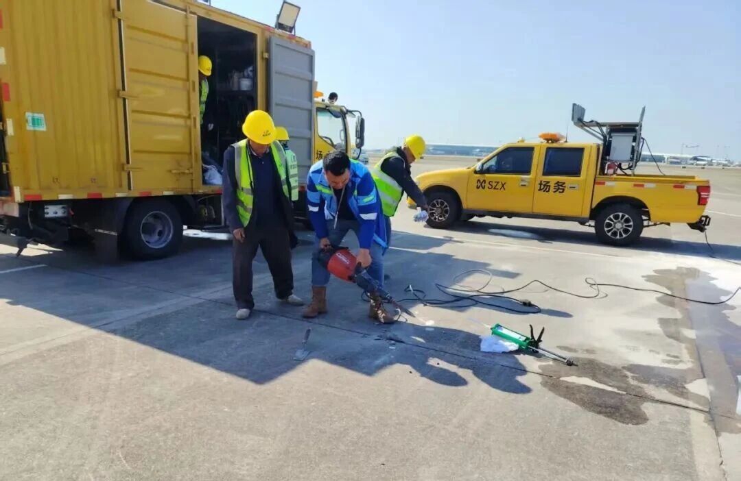 場(chǎng)務(wù)工作人員對(duì)道面進(jìn)行施工(本文圖片均由深圳機(jī)場(chǎng)提供)
